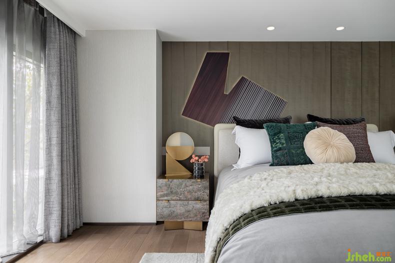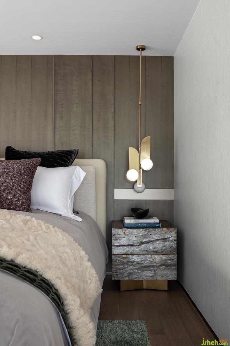 以撞色幾何地毯點(diǎn)綴的主臥空間層次感十足,從實(shí)用的角度到超載的發(fā)揮共同構(gòu)成藝術(shù)的主體。