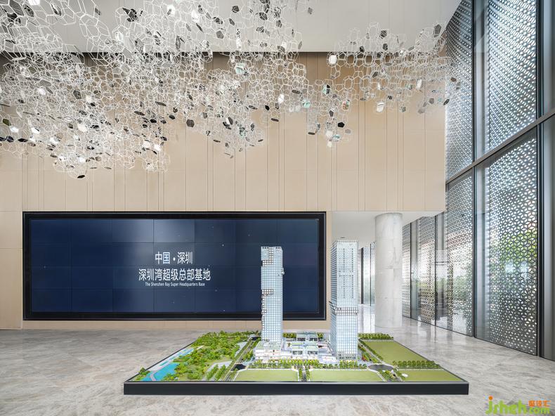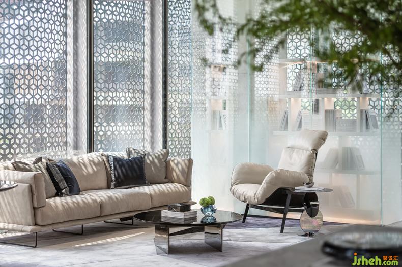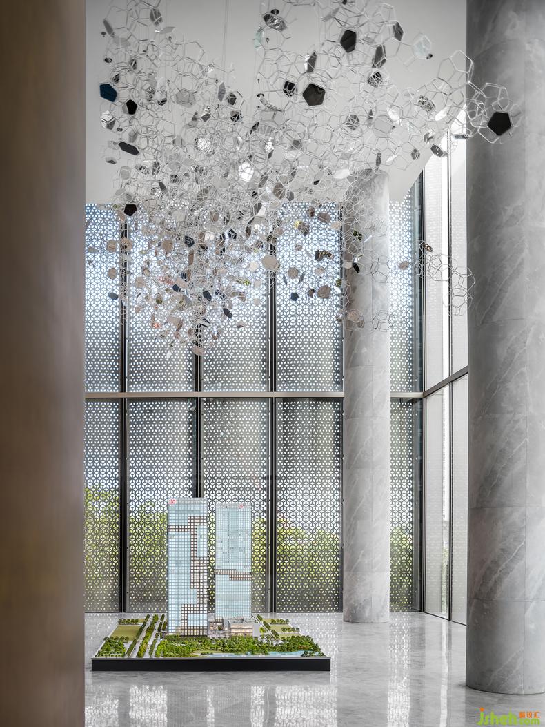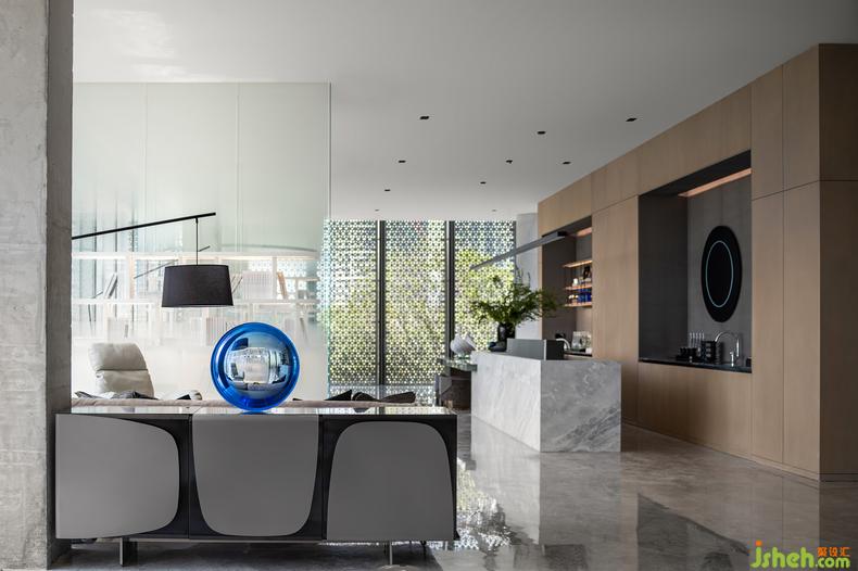 將自然寫進(jìn)生活,一切為提前上演未來生活而服務(wù)。水吧區(qū)的藝術(shù)裝置品《破·曉》將現(xiàn)代與未來相連結(jié),靜謐的藍(lán)宛如沖破時(shí)間縫隙的光,初始熹微,繼而透亮。色彩運(yùn)用干凈利落,空間氛圍在和諧中體現(xiàn)統(tǒng)一。