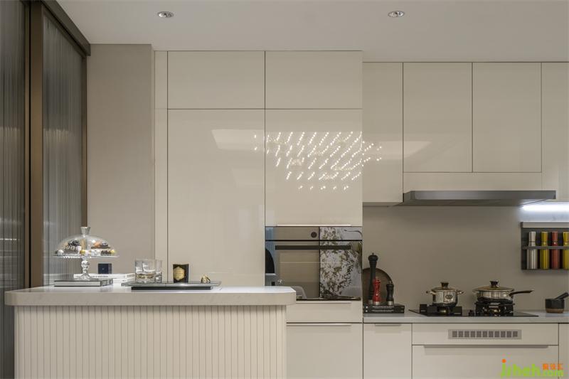 規(guī)整的收納、流暢的動線,不拘泥于餐廚的用途所在,而是將美感延伸開來??臻g藝術(shù)主燈宛如點點繁星散落,流動的藝術(shù)在變換間被注入情感色彩,讓家有了詩意和溫度。