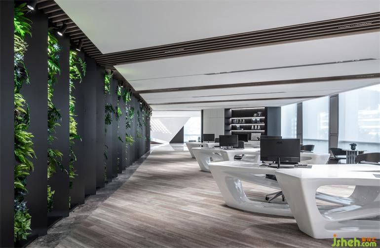 在空間中設(shè)置大面積的綠植墻,讓窗外的景觀及與室內(nèi)空間達(dá)成一種交互對(duì)話, 給予沉穩(wěn)的空間帶來一幕跳躍氣氛。