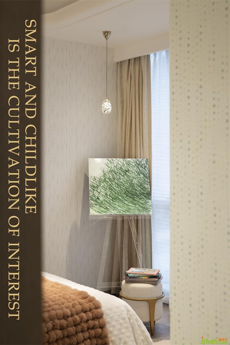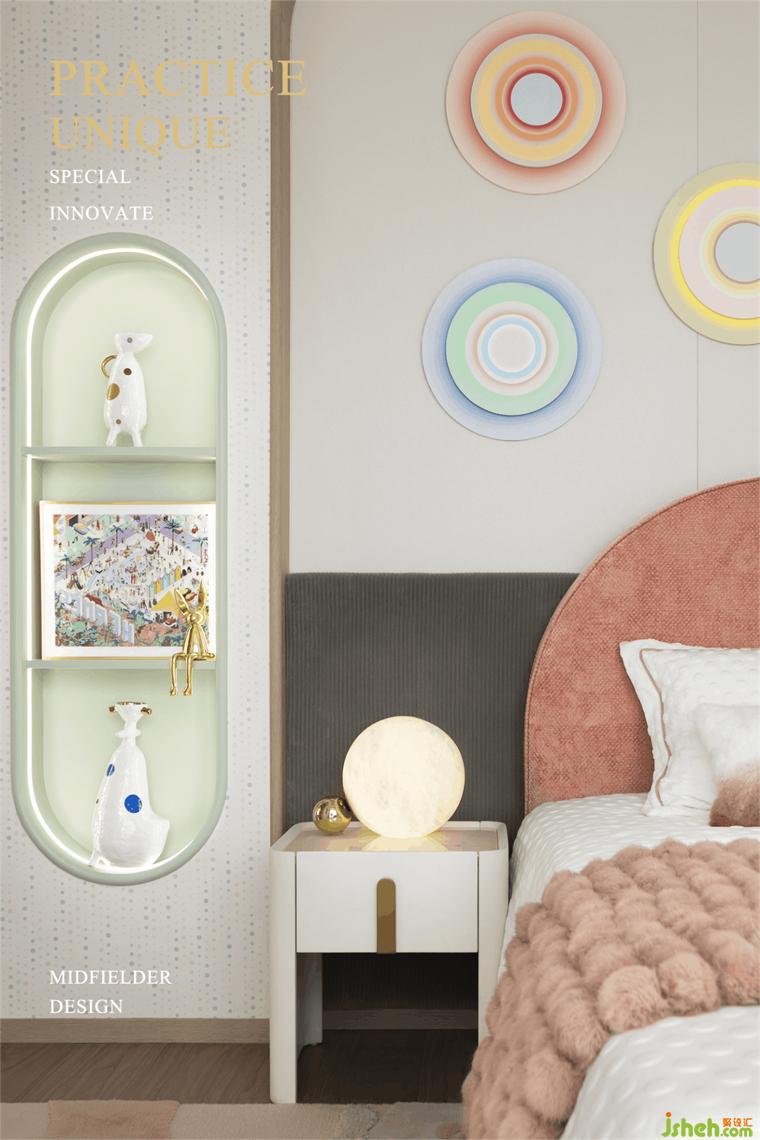 兒童房以藕粉色調(diào)勾勒恬靜的氛圍空間,在此夢(mèng)幻的小世界里,樣板房設(shè)計(jì)承載了小主人繪畫(huà)、娛樂(lè)、學(xué)習(xí)等需求,居者的藏品規(guī)整且自由地靜置于展架之上,靈動(dòng)而不失童趣,是興趣的陶冶,也是對(duì)世界的好奇與探索。