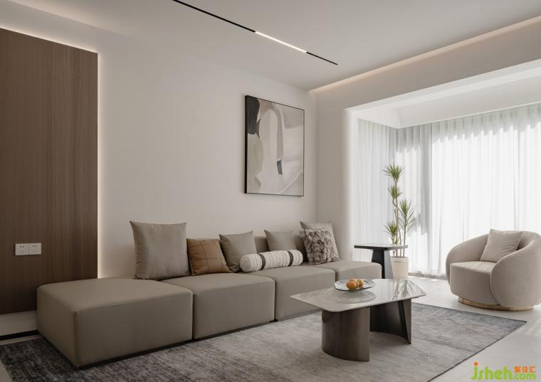 梁位的處理細(xì)節(jié),設(shè)計(jì)師通過(guò)燈光的排布以及弧度造型,盡可能的讓梁融入吊頂之間,通過(guò)弧度關(guān)聯(lián)梁位邊緣線,隱形的區(qū)分每一個(gè)空間。