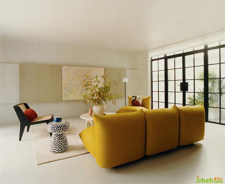 家裝設(shè)計天然石材的吧臺與中古感的木質(zhì)餐桌,組合呈現(xiàn)出自然又質(zhì)樸的輕松氛圍,檸檬黃的arflex Marenco面包沙發(fā)點綴其中,搭配波點的小邊幾又為其中注入了幾分明媚明快的度假感。