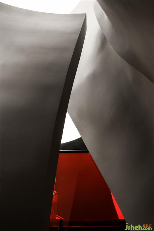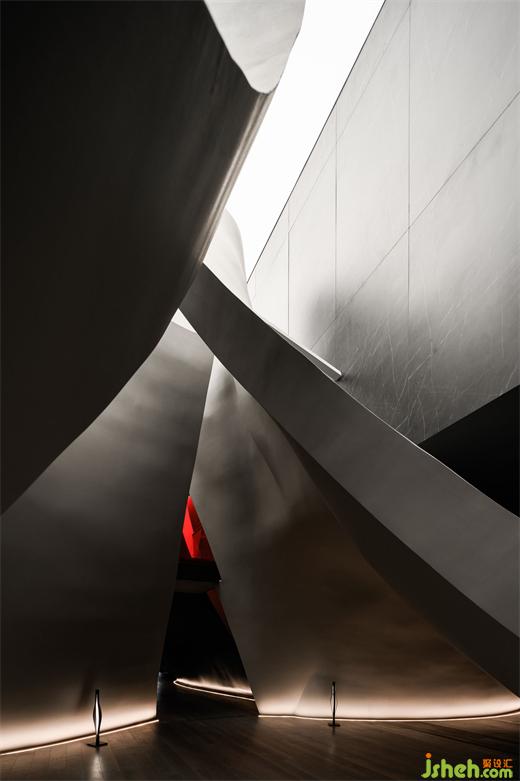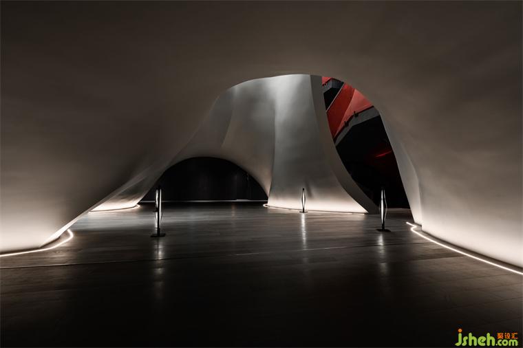 涵洞般的入口被設(shè)計(jì)為一條時(shí)光隧道,讓人想起經(jīng)典科幻電影《2001太空漫游》中的信息流場(chǎng)景。展廳設(shè)計(jì)漆黑光滑的表面上,反射著地面上紅色霓虹曲線的散碎光點(diǎn),模糊曖昧。