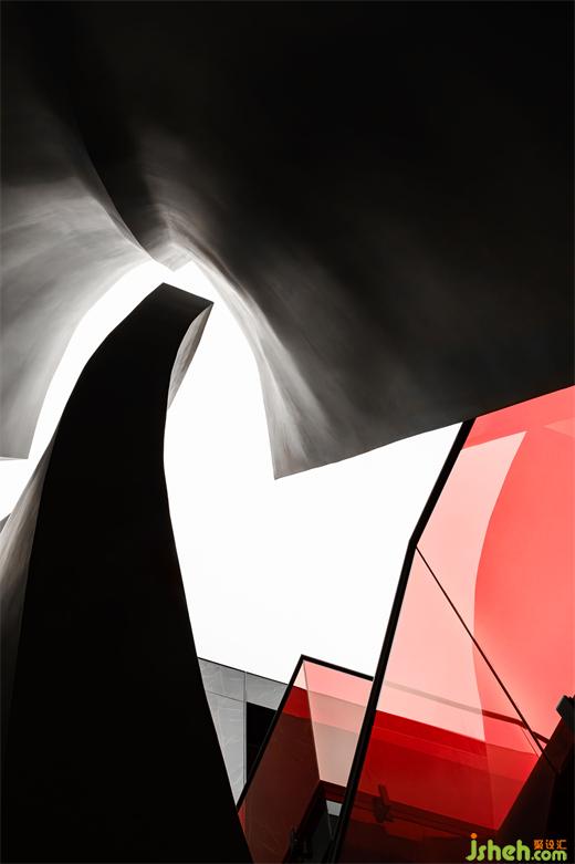 展廳設計灰黑的肌理色調與簡約的直線造型,自然帶有舊上海照片的氣氛。青碧的池水與絳紅的玻璃如時光美酒,熏染著欲醉的倒影。稍憩微微,以備踏步而上,粉墨登場。