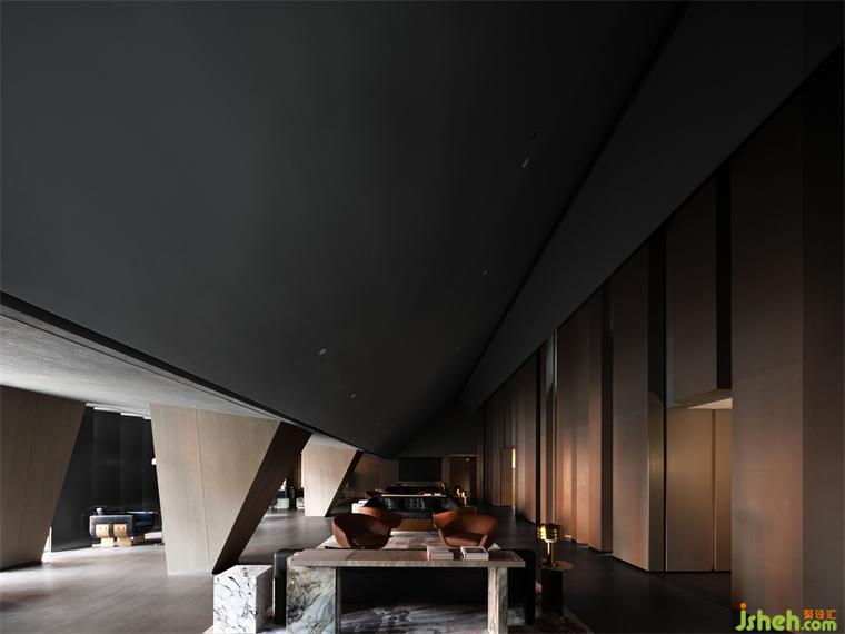 在“巖壁”造型與有機(jī)的弧形墻面以及上層玻璃幕墻之間,產(chǎn)生了大小不一、形態(tài)迥異的垂直縫隙。度假酒店設(shè)計柔和的自然光線傾灑其間,微妙的內(nèi)嵌燈帶氤氳其里。在大廳緩緩漫步,仿佛置身于詹姆斯·特瑞爾的光影藝術(shù)作品中。