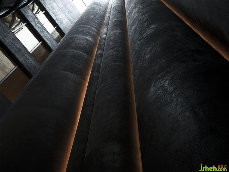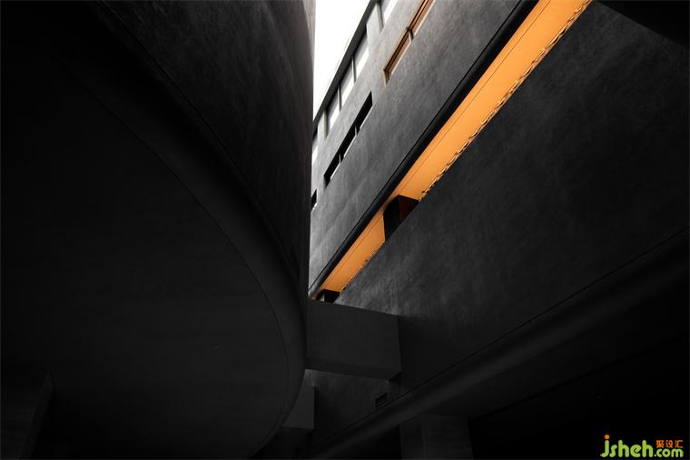 沿著酒店空曠的大廳行進(jìn),梁結(jié)構(gòu)投下的陰影歷歷可數(shù)。倏爾,紀(jì)念碑式的混凝土圓筒結(jié)構(gòu)與玻璃電梯并峙,漫長而嚴(yán)肅的高塔盡頭是天窗里的白云藍(lán)天。與大廳幾何化的“巖壁”一樣,這樣的“人工化”的界面會同時帶來抽離感和安定感,不經(jīng)意間引導(dǎo)人的運動與靜駐。