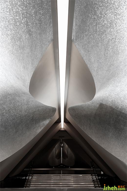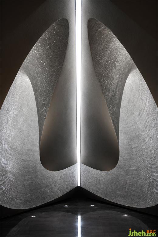 宏大的巨型雕塑式對稱空間和幽暗基調(diào),是心靈之旅的序曲。天花如水流般蜿蜒,弧形墻面包裹出一座內(nèi)建筑。光線在馬賽克表面反射出不同的色彩和質(zhì)感,傳統(tǒng)手工藝與現(xiàn)代建筑在此相遇。