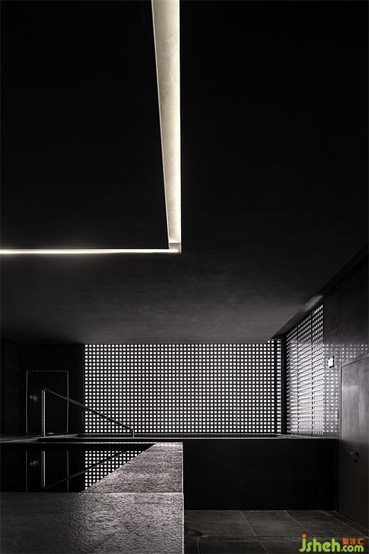 上海洗浴設(shè)計天花板上的細(xì)長光帶與纖細(xì)的金屬扶手彼此呼應(yīng),現(xiàn)代感與理性美構(gòu)成一幅極簡主義畫作。平靜的水面仿佛一面通向未知世界的鏡子,訴說著時間的流逝與永恒。幽暗的空間傳遞出生活哲理與情感共鳴。