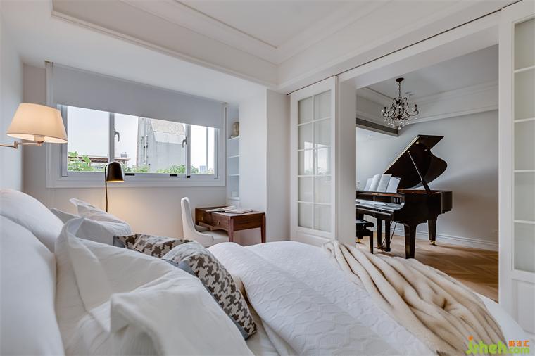 6. 臥室透過(guò)法式格子門看出去,就是女主人鐘愛的演奏鋼琴,一旁大片的采光讓經(jīng)常需要在家寫書的男主人,備感溫暖舒壓。