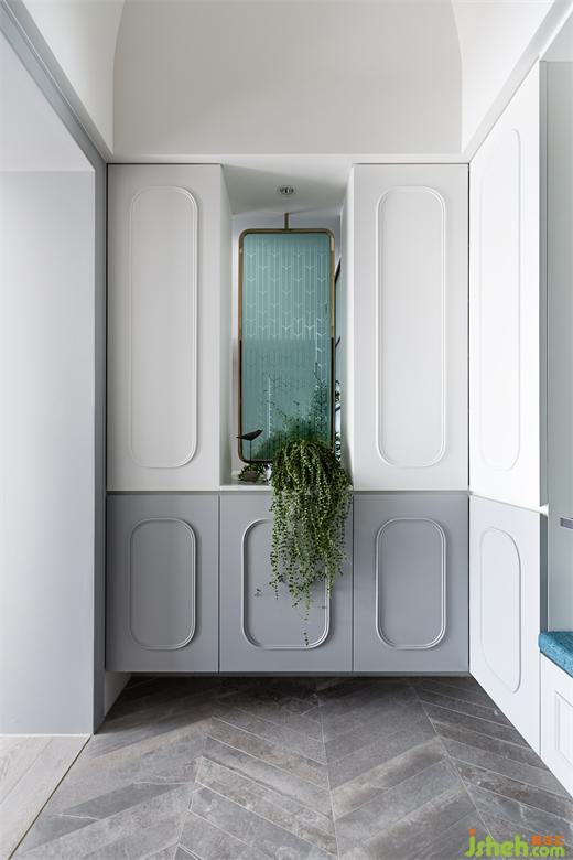 從玄關(guān)處進(jìn)入屋內(nèi),設(shè)計(jì)師將部份墻面重新調(diào)整,大平層設(shè)計(jì)L字型鞋柜和穿鞋區(qū)以滿足女主人大量的鞋子收納。鞋柜延深至天花高度,與上梁切齊,形成歐式的拱門入口,浪漫的女主人同時(shí)也偏愛法式簡約輕古典,鞋柜門片于是采用視覺性豐富但又不失簡約的彎曲線板,勾勒出古典的裝飾氛圍。落塵區(qū)地坪則采用石紋磁磚的魚骨拼法,一入門就營造空間異國風(fēng)格的質(zhì)感。