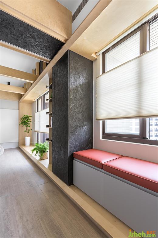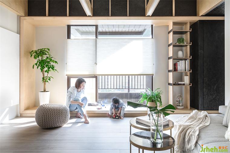 本住宅擁有良好屋高,天花板有趣的設(shè)計(jì)也是本案設(shè)計(jì)的另一大亮點(diǎn)。打斜的天花板實(shí)際上是仿歐式小木屋,豪宅設(shè)計(jì)團(tuán)隊(duì)巧妙的將吊隱式的冷氣機(jī)子隱藏于天花上方,只降低局部天花,并從墻面延續(xù)木屋的直線型木板至天花,色彩上也利用墻面上半部的灰色帶到斜天花,視覺(jué)上間接提升了天花的高度。兩種色調(diào)墻面的后方備有一個(gè)儲(chǔ)藏室,滿足收納大型推車的需求?,F(xiàn)況的兩支上梁橫跨客餐廳與游戲室,設(shè)計(jì)團(tuán)隊(duì)不但不將梁隱藏,還做了另外兩條木作橫梁做為裝飾,延續(xù)歐式木屋的橫梁結(jié)構(gòu)特性,將這三個(gè)開(kāi)放空間串聯(lián)起來(lái)。木作橫梁內(nèi)藏LED間接照明,讓光反射到平天花,顯得空間更為輕盈。因應(yīng)廚房和餐廳的實(shí)用性質(zhì),地板材質(zhì)使用六角銀狐磁磚,從玄關(guān)一字形延伸到廚房,也與上方斜天花的邊界相呼應(yīng),巧妙區(qū)分空間性質(zhì)。餐桌上方配置有不規(guī)則垂吊燈,加入黑色元素,與客廳木窗框上方有著一樣的反差色系,給與視覺(jué)上極簡(jiǎn),又帶有濃烈對(duì)比的立體效果,符合業(yè)主所期待的現(xiàn)代洗斂的北歐氛圍。