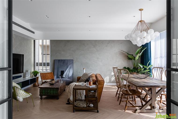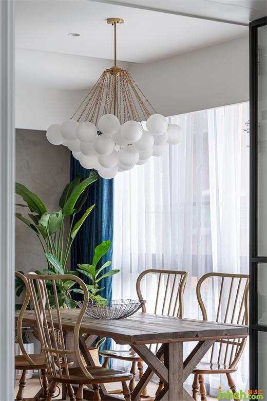 由玄關(guān)進(jìn)入到客廳,再由餐廳進(jìn)入到廚房空間,皆使用雙推門方式,搭配男屋主喜愛的黑白灰做為全屋基本配色,餐廳區(qū)塊使用橄欖綠當(dāng)作跳色,金屬色的吊燈系列,營造室內(nèi)慵懶優(yōu)雅輕奢華基調(diào)。現(xiàn)代感強(qiáng)烈的圓弧造型天花從進(jìn)門玄關(guān)開始,一路延伸到公領(lǐng)域,豪宅設(shè)計(jì)柔和的弧形與空間的線條感強(qiáng)烈的古典相互調(diào)和,佐以窗邊灑進(jìn)充沛采光,讓黑白灰也能很有溫度!