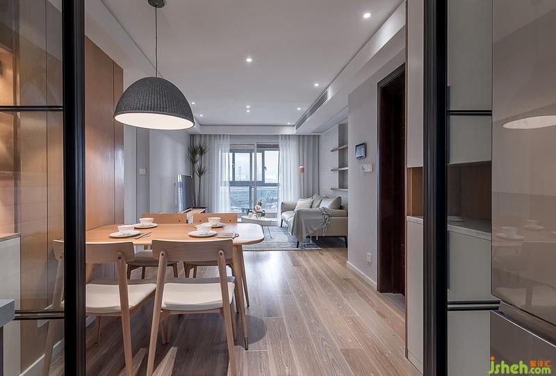 ▲大面積的原木色飾面把內(nèi)嵌式餐邊柜融入一體,無(wú)主燈設(shè)計(jì)的點(diǎn)光源空間,讓空間干凈怡人,全屋唯一的主燈便是餐廳主燈,設(shè)計(jì)師選用了擁有水泥灰色的吊燈去營(yíng)造整個(gè)餐廳空間的采光氛圍。