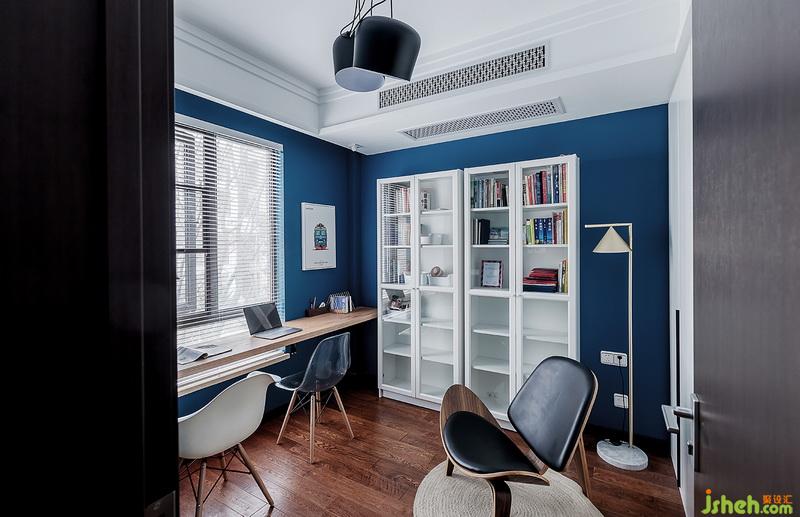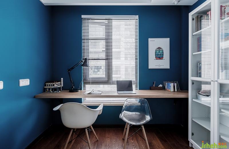 ▲書桌的面是一整塊胡桃木桌面,黑色的工業(yè)風(fēng)裝飾帽子燈和臺(tái)燈,在藍(lán)色墻面漆下自然活波起來。