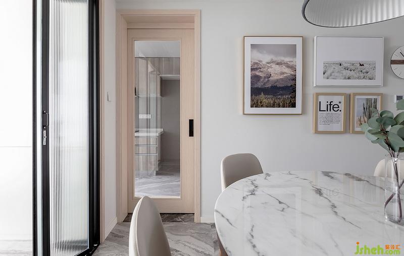 廚房采用的是雙飾面材質(zhì),擁有了天然木紋的質(zhì)感,同時(shí)兼顧后期油漬的清洗;而衛(wèi)生間淋浴房則選擇了天然的火燒板,拉槽處理+火燒面特征,使得淋浴防滑和自然人文氣息。