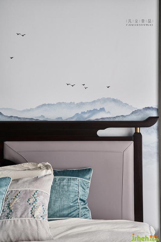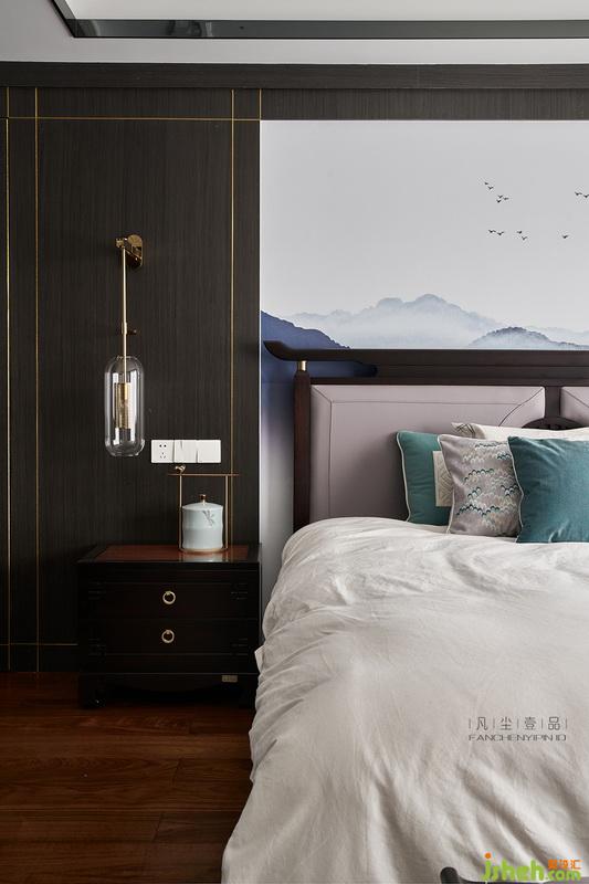 臥室的淺色調(diào)搭配家具莫蘭迪色系的軟包,墻壁為定制古韻壁畫,地板為天然黑胡桃木、豐富的色彩插入點綴了煙灰的空間,細膩處從容儒雅。