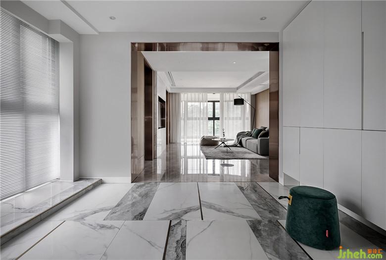 傳統(tǒng)意義的大空間戶型設(shè)計中,玄關(guān)會去做一些“圍擋”,但此案中我們并不希望去做這些常規(guī)技巧,空間的通透和儀式感才會有張力,搭配整體落地玻璃窗讓光線融合。