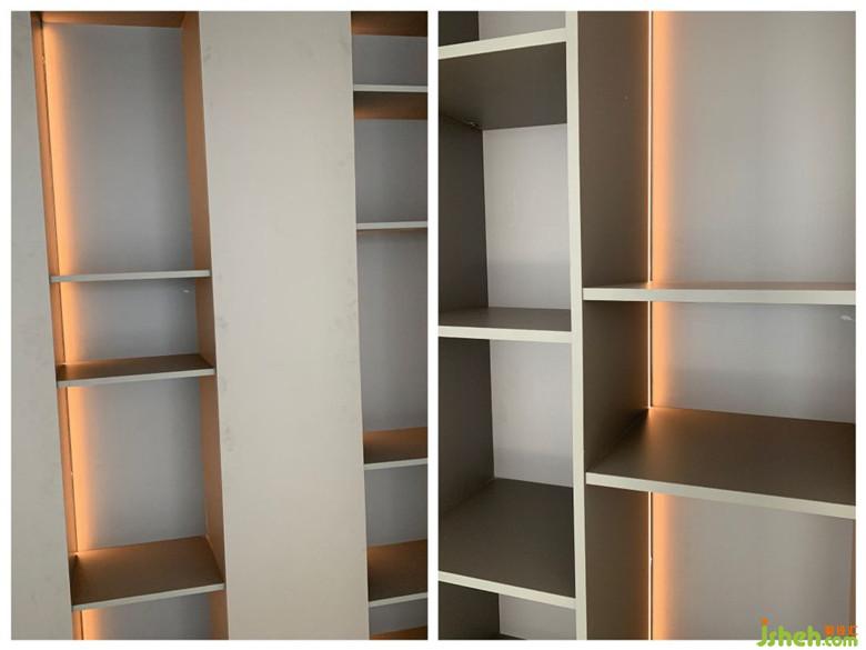 主臥衣帽間,層高≈2700mm,設(shè)計(jì)了整面到頂?shù)囊鹿瘢瑸榱吮WC如此高度的門片不變形,采用了一體式鋁合金邊框拉手柜門,而上下各預(yù)留了0.5cm-1cm的空間間隙,