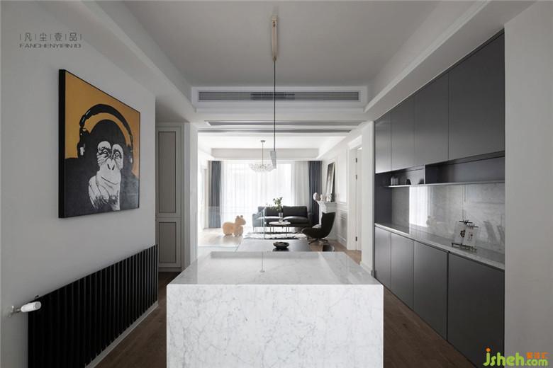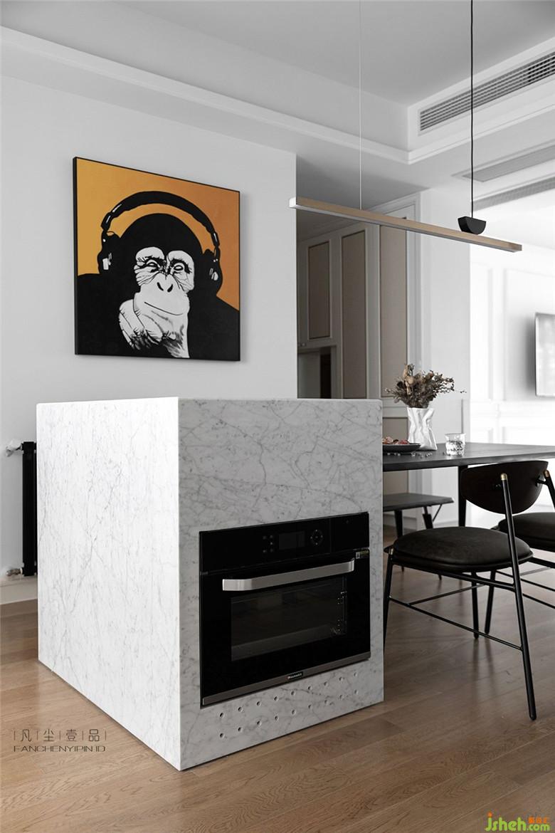 餐廳的中島+餐廳組合,利用原本就狹長(zhǎng)的餐廳空間,設(shè)計(jì)一體式內(nèi)嵌烤箱和廚衛(wèi)電器組合,解決廚房空間無法再增加這些功能的現(xiàn)實(shí)問題。
