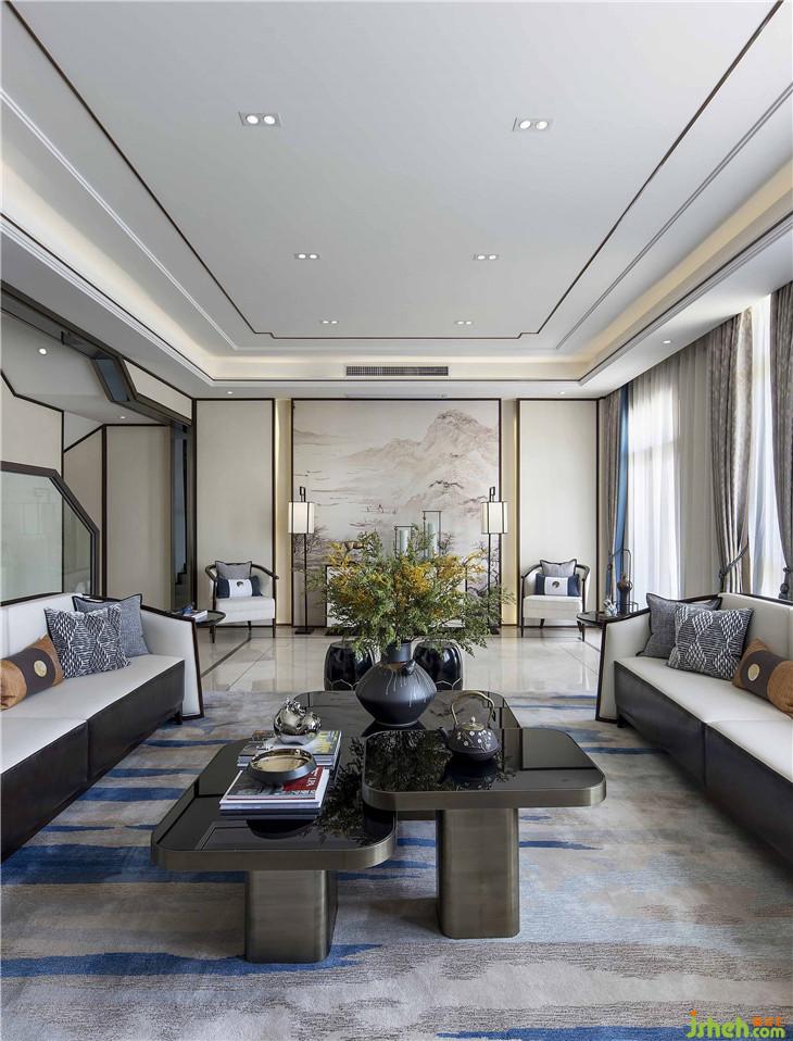 客廳空間清朗開闊,左右通透的玻璃窗,簡(jiǎn)練的布置和精美的裝飾,讓人有賓至如歸之感。入口門廳處,背景墻為一幅極為清雋的人文山水畫卷圖,近乎白描的線條,抒寫著山水悠然意境,讓自然情趣在空間自然彌漫,兩側(cè)放置簡(jiǎn)雅的新中式地?zé)?、圈椅,將《宋史》中所提及的“耳目清曠,不設(shè)機(jī)關(guān)以待人,心安閑而體舒放”的自在感納入空間。