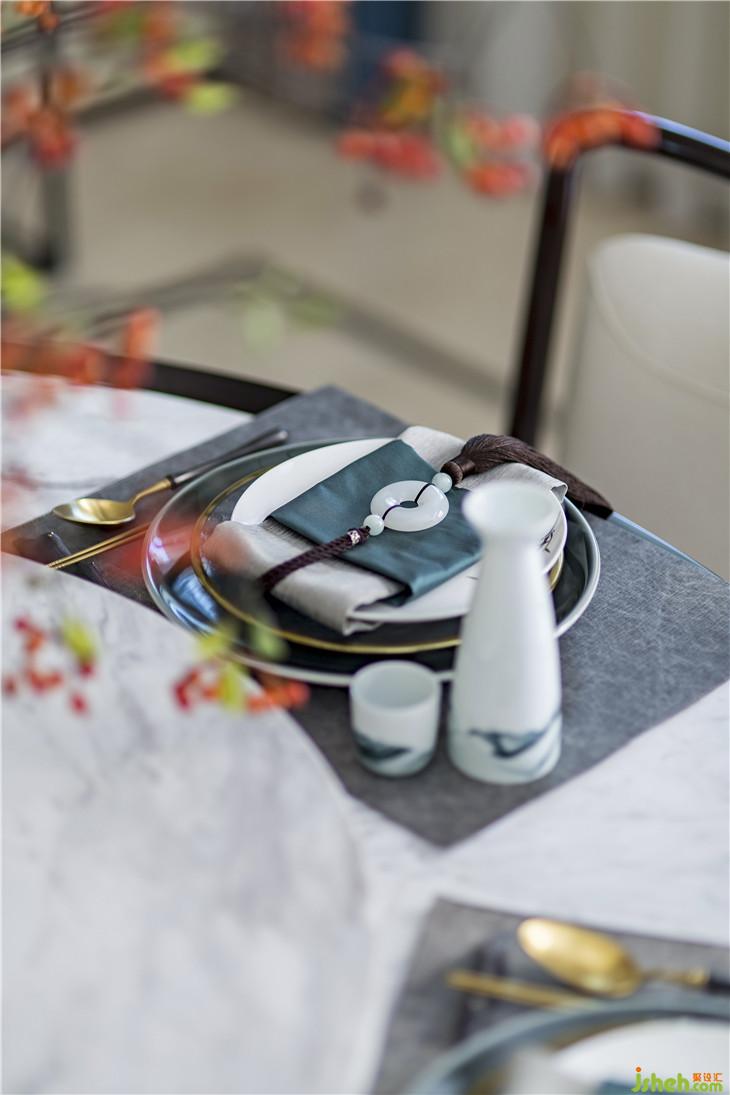 簡(jiǎn)約的空間形制,給予人一種回歸自然、俯仰自得的圓融自在感,傳統(tǒng)而溫馨的圓桌,中式白瓷搭配肆意生長(zhǎng)的枝椏、紅果,別有一番鮮麗動(dòng)人的意韻,居住的詩(shī)意成了餐桌上一小片風(fēng)景。
