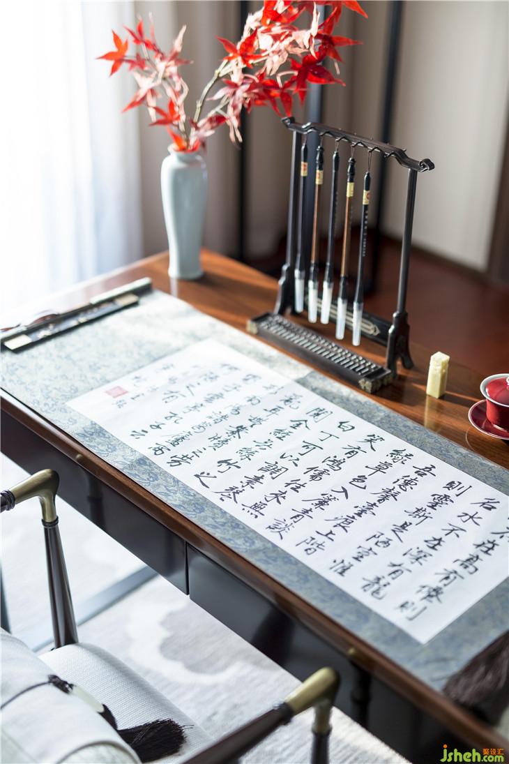 中式風(fēng)格的空間,自然流露出一種經(jīng)久不息的古典氣質(zhì),以高潔素雅為尚。在書法室的呈現(xiàn)中,清貴之氣與書卷氣交融?!安灰丝漕伾茫涣羟鍤鉂M乾坤,”元代詩(shī)人王冕的詩(shī)句,洋溢著磊落浩然之氣,也凝煉在這個(gè)空間中。
