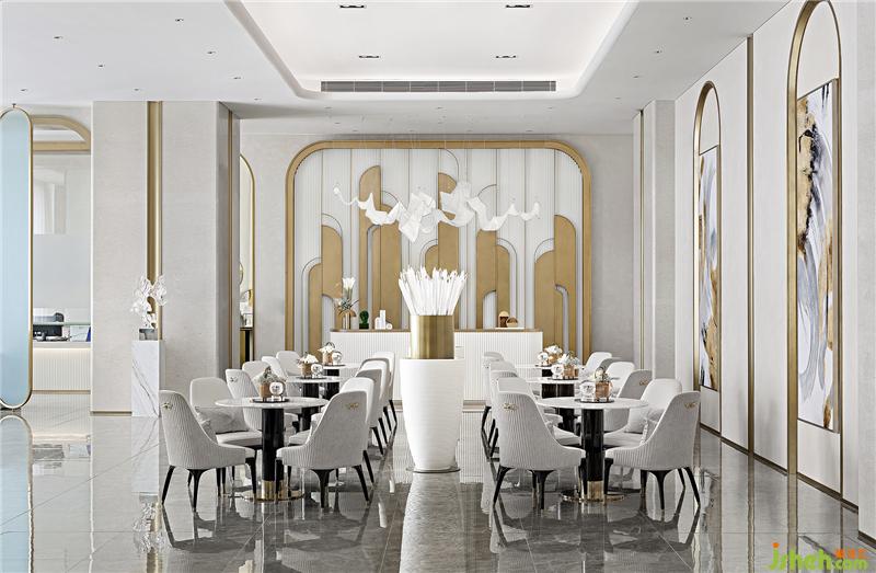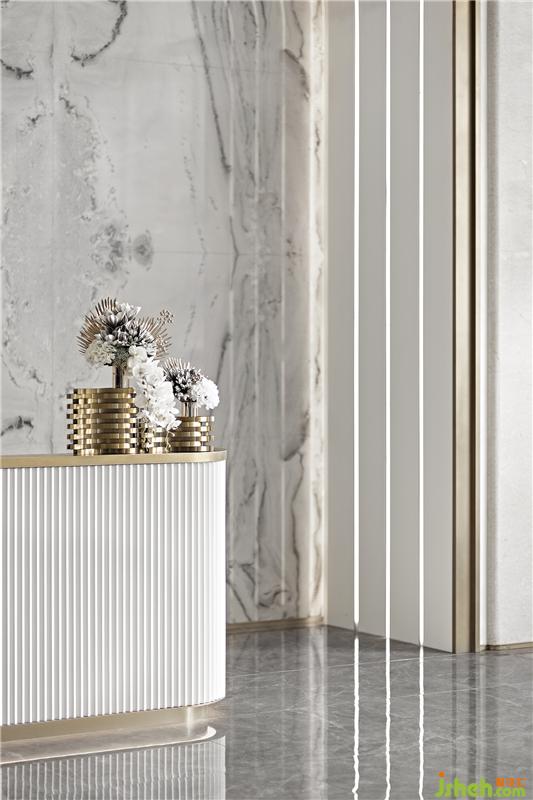 白凈的折線與拱形的金屬形成兩種極致的對白與呼應,設計師以無窮的想象把無意識的行動轉(zhuǎn)化為可見之物,將物體的輪廓用藝術(shù)語言再度改編,理性與感性的交疊與平行中,用設計為售樓中心全新賦能。
