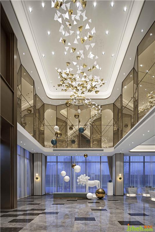 金色與透明相間的幾何水晶吊燈,看似無序?qū)崉t規(guī)律地串聯(lián)起一個(gè)灑脫、未來感十足的現(xiàn)代酷炫空間印象,與接待臺(tái)背景墻燈光、墻面裝飾線條以及接待臺(tái)立面造型的規(guī)律秩序形成視覺上的互補(bǔ),讓觀者不斷地產(chǎn)生期待與驚奇。裝修設(shè)計(jì)