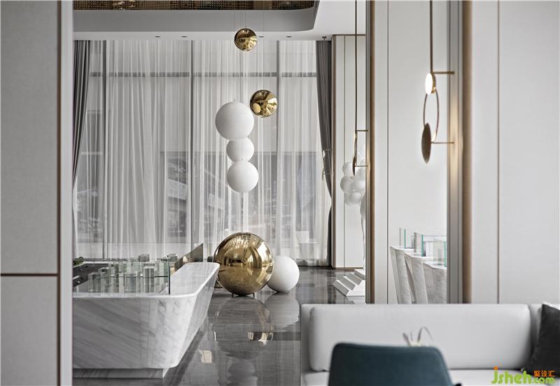 洽談區(qū)奶白的色調(diào)勾勒簡(jiǎn)潔、寧謐的商談氛圍,翡翠綠與透明小水晶疊合而成的裝飾吊燈,星光點(diǎn)點(diǎn),觥籌交錯(cuò)。有序的線條適度糅合,豐富了空間的層次,浪漫感與文脈精神合為一體,增加空間的藝術(shù)感染力。