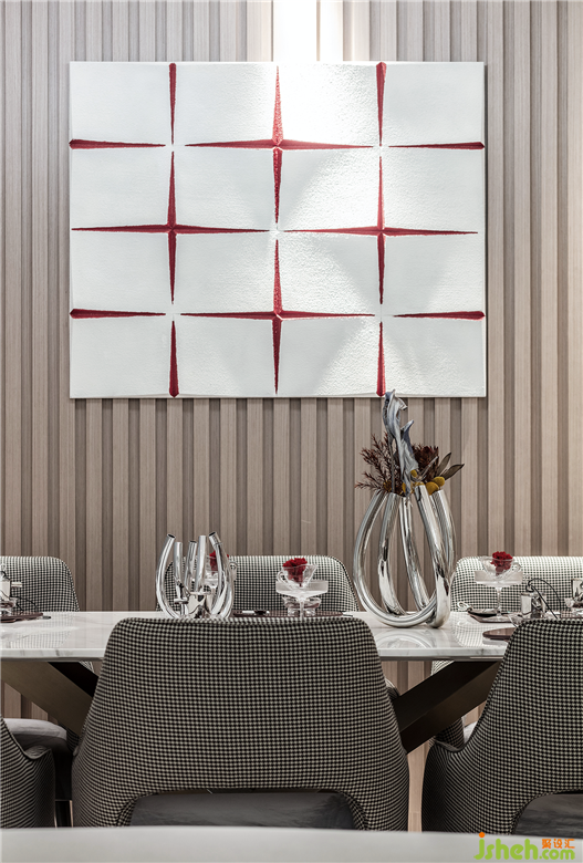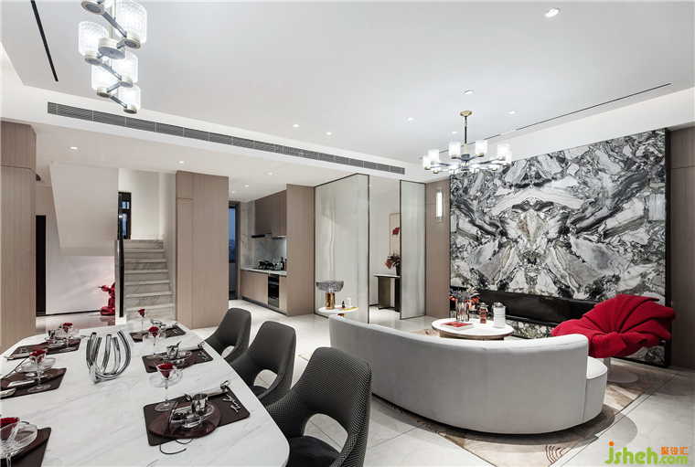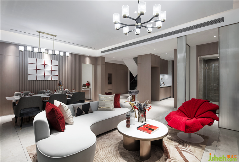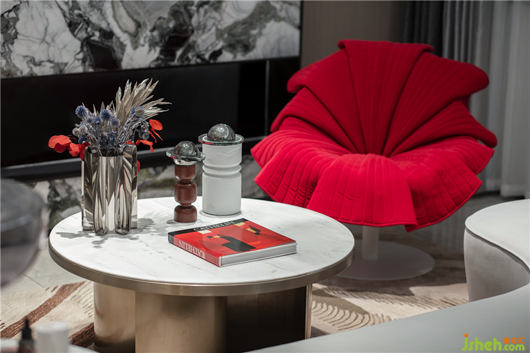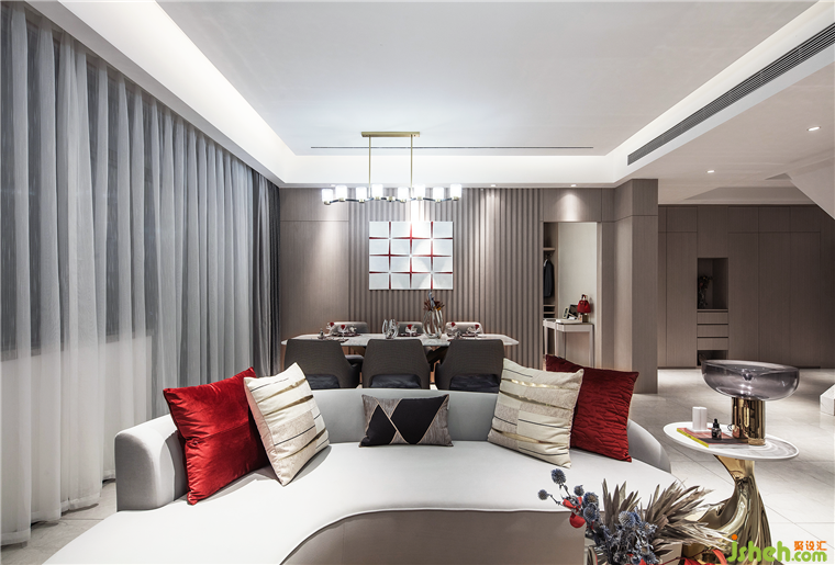 這是一個(gè)上層疊墅樣板房,以極具女王氣場(chǎng)的Dior999紅,作為空間的主角,營(yíng)造自信、灑脫的開場(chǎng)白,高調(diào)的紅與低調(diào)的灰,兩種極致的時(shí)尚色系相互碰撞,呈現(xiàn)一個(gè)新興雅致的時(shí)尚況味。紅色的沙發(fā),恰如一朵盛放的紅色玫瑰,展示秀美瑰麗的絕代芳華。