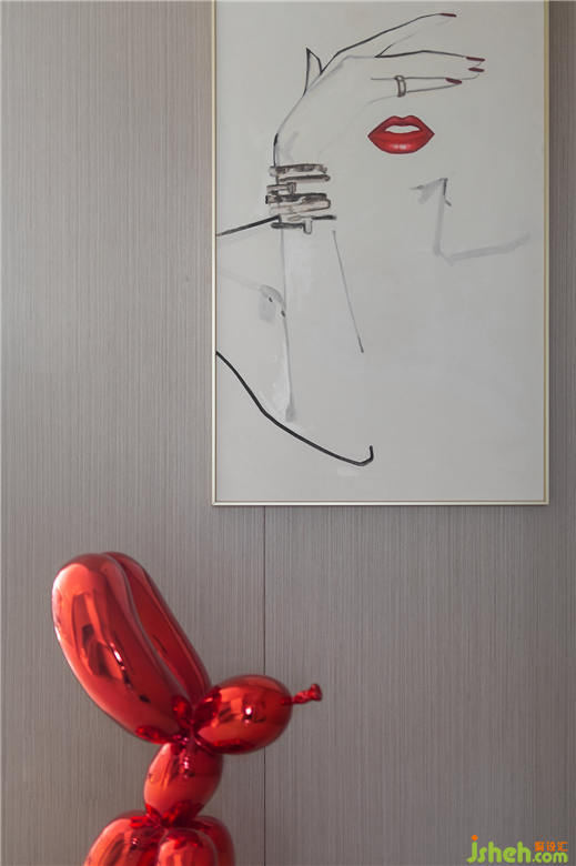 火紅的抽象雕塑裝置,予人強(qiáng)烈的視覺沖力,令人過目難忘。烈焰般的色彩與裝飾畫中嬌艷的紅唇相映成趣,呈現(xiàn)獨(dú)特而極具張力的美麗風(fēng)范。