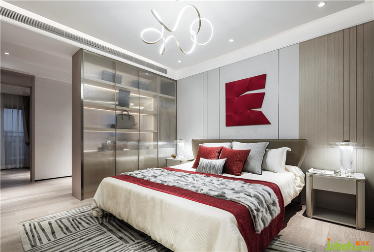 主臥室中紅色依然是最閃耀的存在,濃淡不一的紅色與質(zhì)樸的木形成涇渭分明的對(duì)比,在熱情與內(nèi)斂之間,極具曲線美的蜿蜒吊燈,以極致的優(yōu)雅,中和了空間的氣質(zhì),色彩濃度及材質(zhì)的調(diào)制,一切都恰到好處。