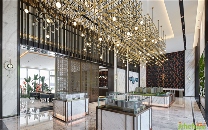 裝飾藝術落實到每一個細節(jié):櫥柜里的科技紅燈光,帶著低調致奢的貴族氣息,復原Art Deco的時代精神。接待臺精致的折線藝術、洽談椅的藍色菱形軟包,凝練幾何美與韻律感強對比的空間美學節(jié)奏。