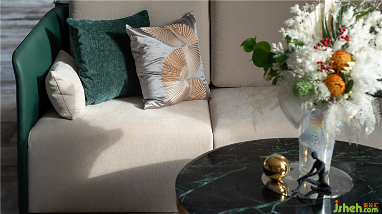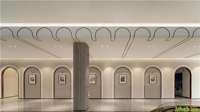 本案營銷中心設(shè)計以流行色米色為基調(diào),呈現(xiàn)上海文化的雅致與高級基調(diào),參考老上海建筑和平飯店、旗袍、團扇、黃浦江、黃包車等元素,試圖帶領(lǐng)來訪者重新穿越到四五十年代的老上海芳華。墻面借鑒時光長廊的拱門設(shè)計,有著撲面而來的復(fù)古風(fēng);以旗袍文化復(fù)刻老上海裝飾藝術(shù)派的高雅精致腔調(diào),雕塑以飄逸的裙擺,旋轉(zhuǎn)的曲線展示摩登女性魅力,體現(xiàn)東方的韻味與西方的浪漫糅合碰撞。室內(nèi)椅子、枕頭等家私上多處以細節(jié)營造出上海風(fēng)情雅致,有黃埔江上江水滔滔,貨船川流不息,江邊黃包車、小汽車來來往往,載著商圈名人、摩登小姐來到和平飯店,將這座城所獨有的氣息濃縮在此。