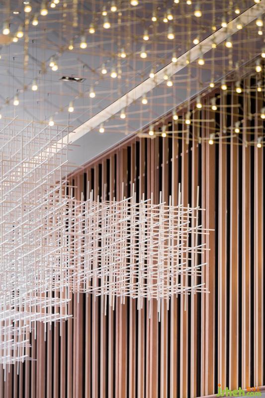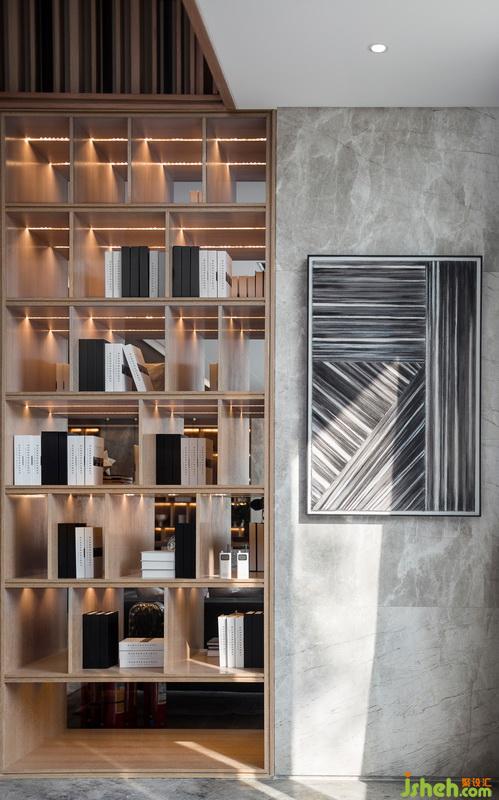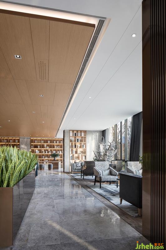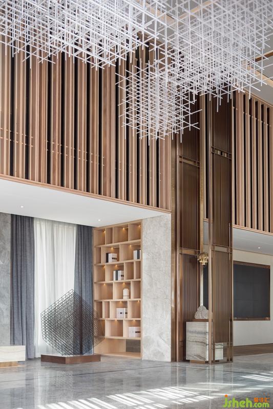 進(jìn)入接待前廳,入眼便是淺色大理石背景體塊與地面對比所帶來的視覺沖擊。自然光穿透木格柵在地面映下斑駁光影,強化了空間入口的互動性與儀式感。接待臺室內(nèi)設(shè)計師引用建筑穿插手法,將水紋肌理的玉石點綴其中。細(xì)看接待臺背部立面,“長江之水”的圖紋融入石材與木格柵深淺韻律,亦如暗示訪客,這場“停留”之境的序幕已漸漸拉開。