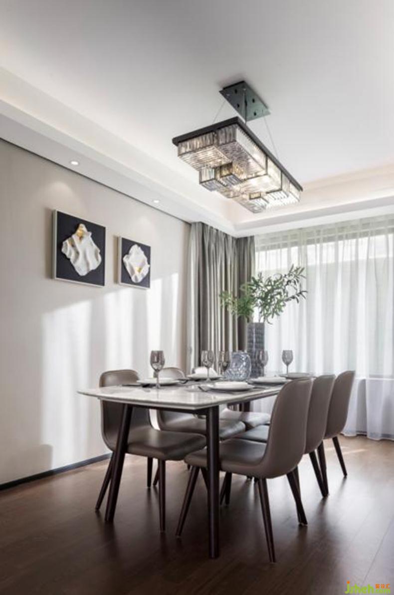 客餐廳呈狹長式布局,在立面與吊頂連接處,融入黑色金屬嵌條,既起到明確吊頂、墻面、地面三者關(guān)系的作用,又增加整體層次感。木質(zhì)背景墻的暗門設(shè)計(jì),保證了視覺一體呈現(xiàn)。陽臺(tái)玻璃移門如同天然背景,引入充足陽光,同時(shí)與室外景色虛實(shí)交替,感知生命的活力。肌理感明顯的玻璃移門實(shí)現(xiàn)餐廳與廚房的串聯(lián)與分割,靈活塑造出空間韻味。室內(nèi)設(shè)計(jì)師
