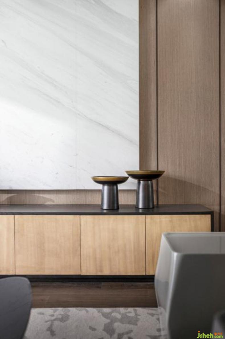 主要材料 | 木皮染色飾面、爵士白大理石、壁紙 、皮革、金屬板鍍黑鈦