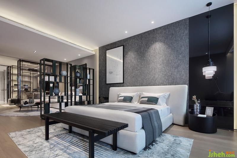 主臥套房?jī)?nèi)設(shè)起居室、衣帽間及主衛(wèi),各功能空間呈開放遞進(jìn)式布局。室內(nèi)淺咖色皮革、紋理感強(qiáng)烈的壁布與黑色鏡面碰撞,都市格調(diào)感油然而生。