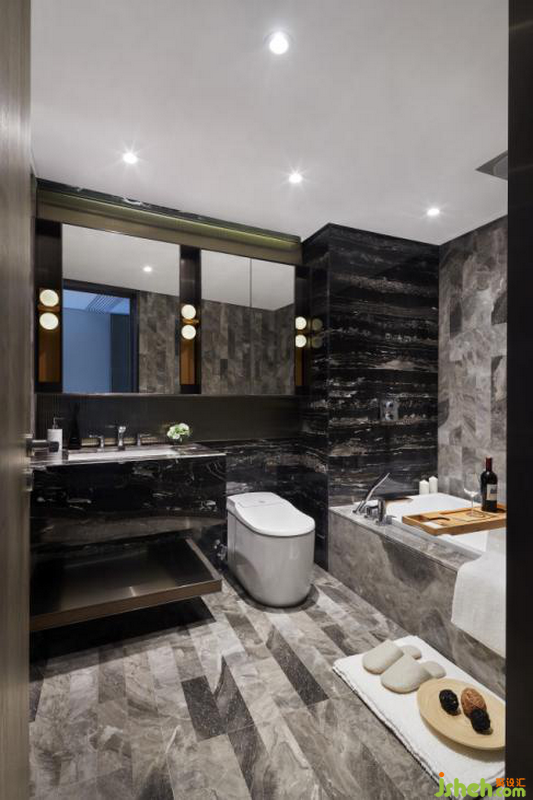 主衛(wèi)內(nèi)不同石材混搭刻畫出肌理、明暗的變化,精心設(shè)計(jì)的鏡柜,通過唯美的規(guī)劃分割,完美實(shí)現(xiàn)功能與美感的結(jié)合,盎然有趣。