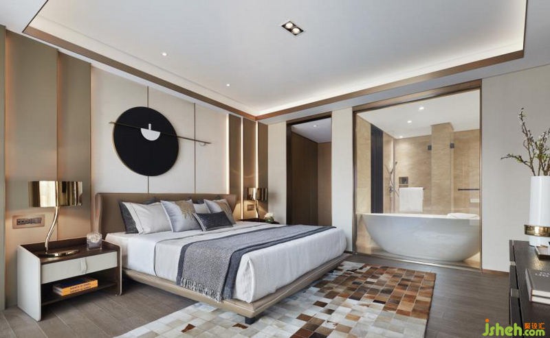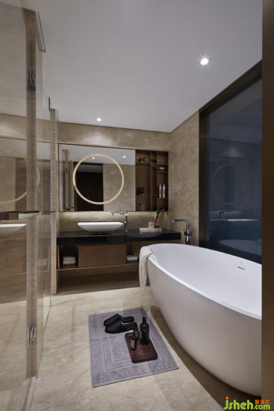主衛(wèi)與臥室以霧化玻璃相隔,在明暗有致的燈光映射下,方圓形態(tài)的對比融合中,滌蕩出虛實朦朧的意境。
