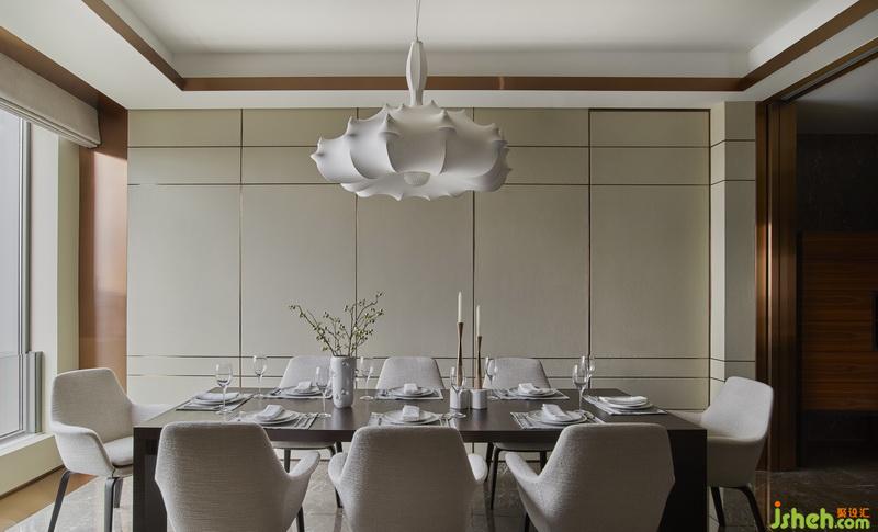餐廳以高級灰皮革飾面鋪呈,金屬包邊精確分割布局,靜美的白色藝術(shù)吊燈柔和空間硬朗線條,花枝與燭臺裝點成趣,干凈疏朗的氛圍里彌漫著一絲浪漫情調(diào)。