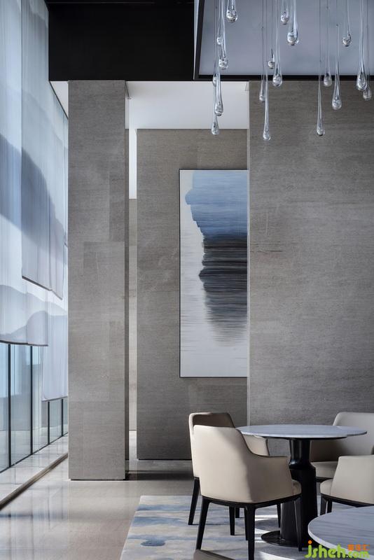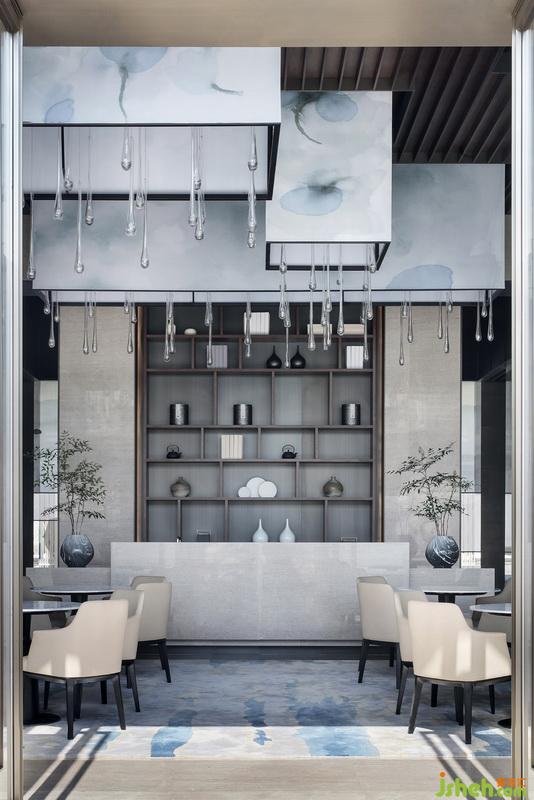 洽談區(qū)頂端延續(xù)沙盤區(qū)的手法,水墨暈染吊燈以體塊穿插于木格柵,其紋路似花瓣散落,又若云霧繚繞,而正要墜下的水滴狀進(jìn)一步提升其空靈意境。開敞式布局在收放自如中平衡著空間的取舍之道,色澤、形態(tài)、體量和諧融入整體空間,陽光透過簾幔映入其中,從立面到頂面,詩意的格調(diào)躍然而出。