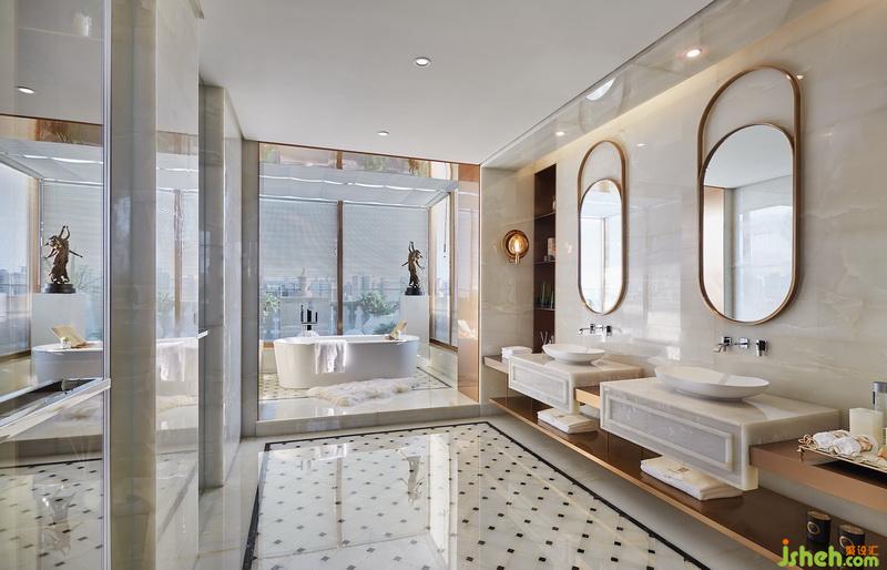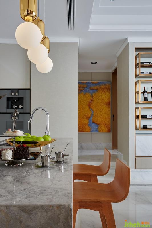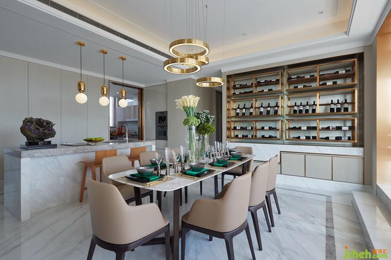 無論外面的露臺,還是室內(nèi)的吧臺,餐廳、廚房、家庭廳、浴室都能看到外灘的景色。整體風格偏曼哈頓風,現(xiàn)代前衛(wèi)又有優(yōu)雅的藝術(shù)氣質(zhì)。在設(shè)計手法上匯集全球多元文化,展現(xiàn)出國際都會的夢幻色彩與超脫浮華的高雅氣質(zhì)。