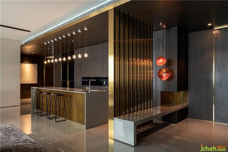 入門即見金屬格柵,巧妙配以燈光做點(diǎn)綴,更有懸浮柜體與石材穿插,滿足生活功用與審美,彰顯精致品味。透過格柵形成錯(cuò)動(dòng)相間、虛實(shí)對(duì)比的效果,氤氳出朦朧之美。