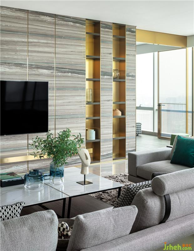 主要材料| 卡斯特灰大理石、貝金米黃大理石、馬賽克、定制金屬網(wǎng)、胡桃木、烤漆板、皮革、壁布