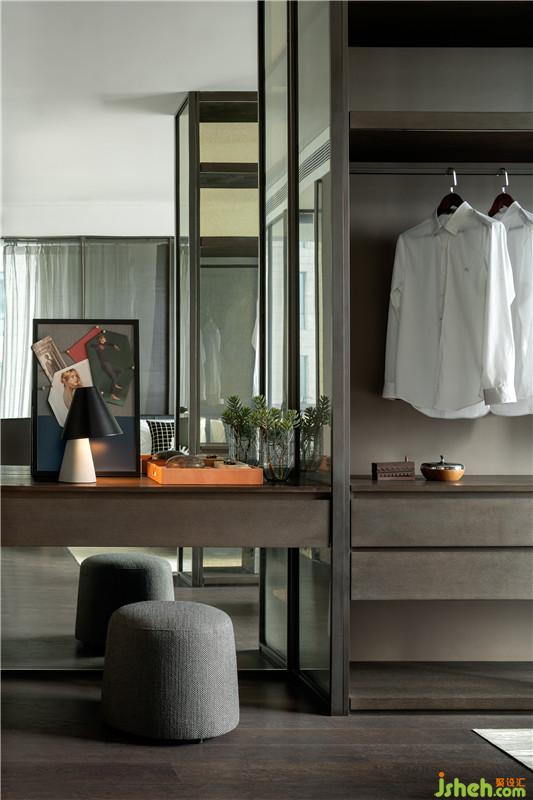 衣帽間與臥室的環(huán)繞型動(dòng)線讓整個(gè)空間更加聯(lián)動(dòng)、緊密,夾絲玻璃、鏡面的精心設(shè)置,虛實(shí)交融,讓空間有效舒展,又凸顯層次。