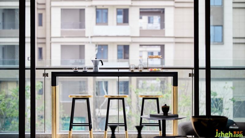 觀景陽臺是客廳向室外的延伸,以實木和金箔打造吧臺區(qū),精致與休閑感并存,于此盡攬戶外風光,頗有“鬧中取靜”、“忙里偷閑”之態(tài)。