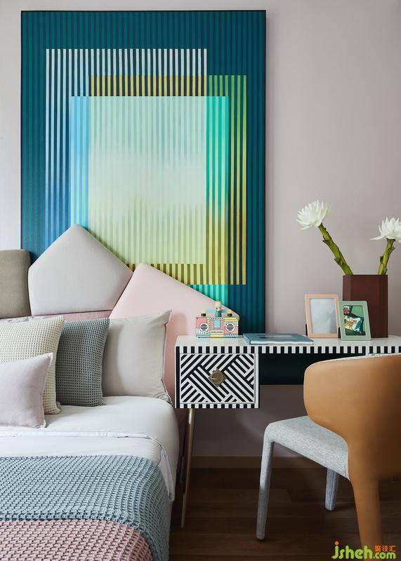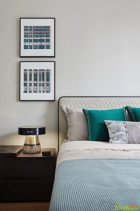長(zhǎng)輩房以淺灰色壁布鋪陳,墻面借用非常規(guī)的側(cè)面裝飾畫(huà)營(yíng)造現(xiàn)代氛圍,以柔和亮色作映襯,渲染一種親和淳樸、安享自身的人生態(tài)度。