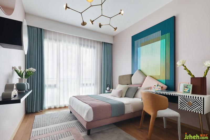 女孩房追求粉嫩、歡快、活潑的氛圍,大尺寸裝飾畫(huà)將床、書(shū)桌連為一體,強(qiáng)化高低錯(cuò)落之感,化散為整,裝飾畫(huà)與書(shū)桌條紋又各相呼應(yīng)。不規(guī)則枝丫型吊燈裝點(diǎn)天花,瞬間多了一絲俏皮與靈氣。